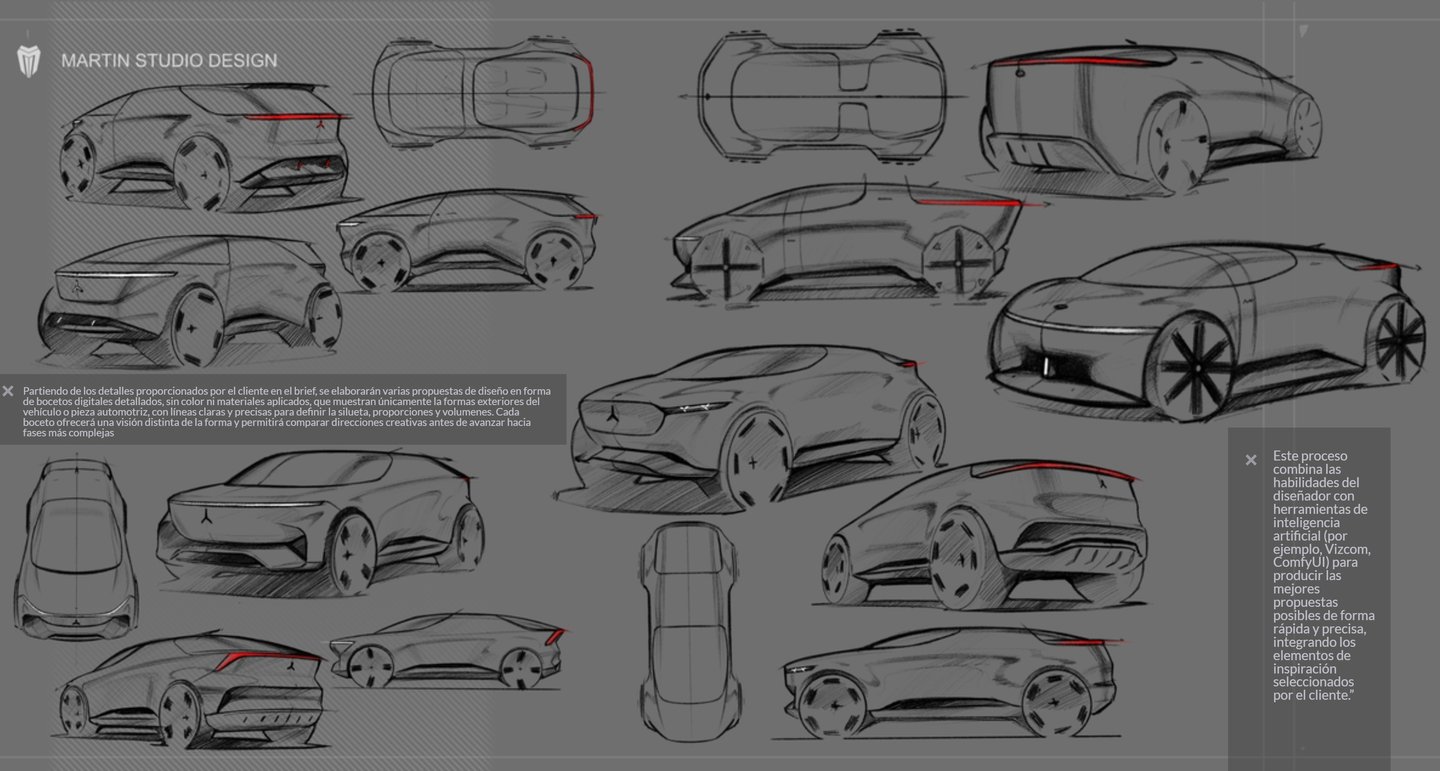 Empleando herramientas de inteligencia artificial como ComfyUI, Vizcom y Forge, el boceto pasa por un proceso de renderizado en el que se seleccionan colores y materiales. De esta forma, se puede determinar la mejor opción para el cliente de manera más rápida y detallada, logrando un resultado de alta calidad.